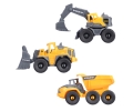 Cada vehículo tiene una parte móvil (brazo de excavadora, pala o plataforma de carga con bisagras), para recrear escenas típicas de una obra en progreso.